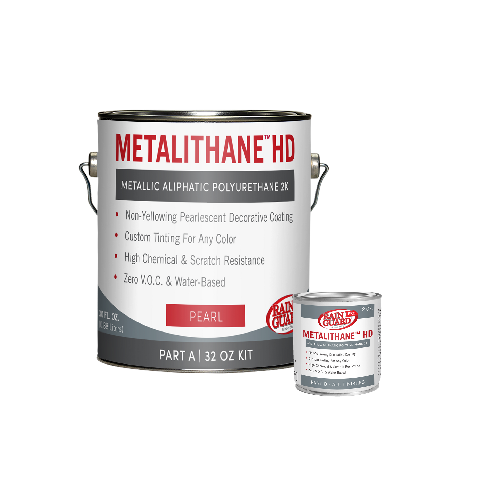 Metalithane HD is a two-component aliphatic urethane available in a wide variety of metallic finishes, including pearl and solid options. It is a high-performance, zero VOC coating that has excellent scratch and chemical resistance for high-end metallic finish uses. It can be applied on a wide variety of substrates and has excellent adhesion to slick surfaces. The standard pearl and solid metallic options are available in a pre-mixed gallon. The metallic flake can be purchased separately and added to create custom effects. A local RainguardPro sales representative can assist with custom effects, drawdowns and color matching when requested.