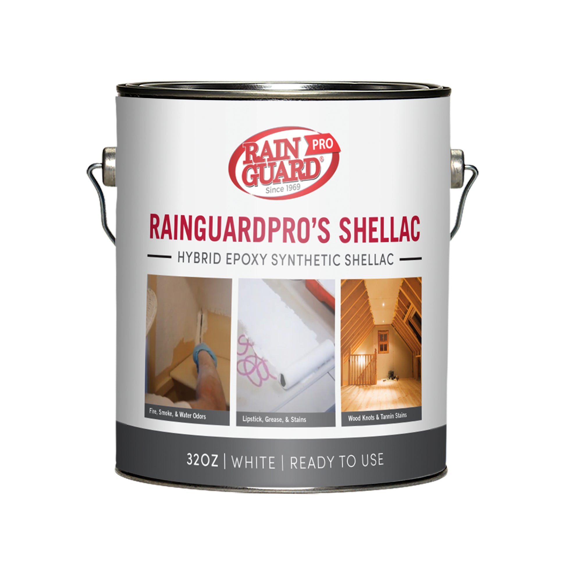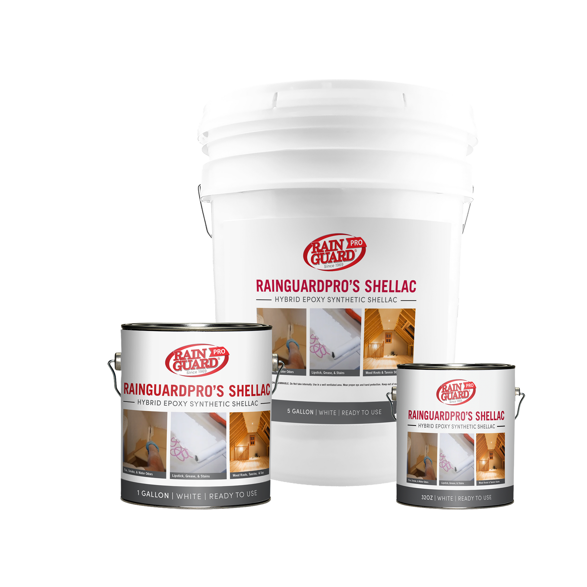 Looking for one coat coverage? Look no further than RainguardPro's Shellac, a water-based hybrid epoxy synthetic shellac primer that offers unparalleled stain blocking. It can be used on interior or exterior surfaces and seals stains from water, smoke, and fire damage. This shellac primer can also be used on wood to stop bleeding tannins, knots, and sap streaks. Formulated to block even the toughest odors caused by mold and mildew, cigarettes and cigars, fire and smoke damage, pet urine, and more. Stop ruining your tools! RainguardPro’s Shellac is water-based which means clean up is easy with just soap and water.